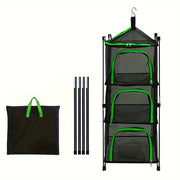 This practical 3-tier storage rack is a must-have for every camper! It provides a convenient way to keep your cooking utensils, tableware, or even fruits and vegetables dry and organized. The rack is foldable, lightweight, and can easily be hung on a hook, making it perfect for outdoor use. Thanks to its durable nylon construction, the rack can withstand the elements, ideal for any camping trip!